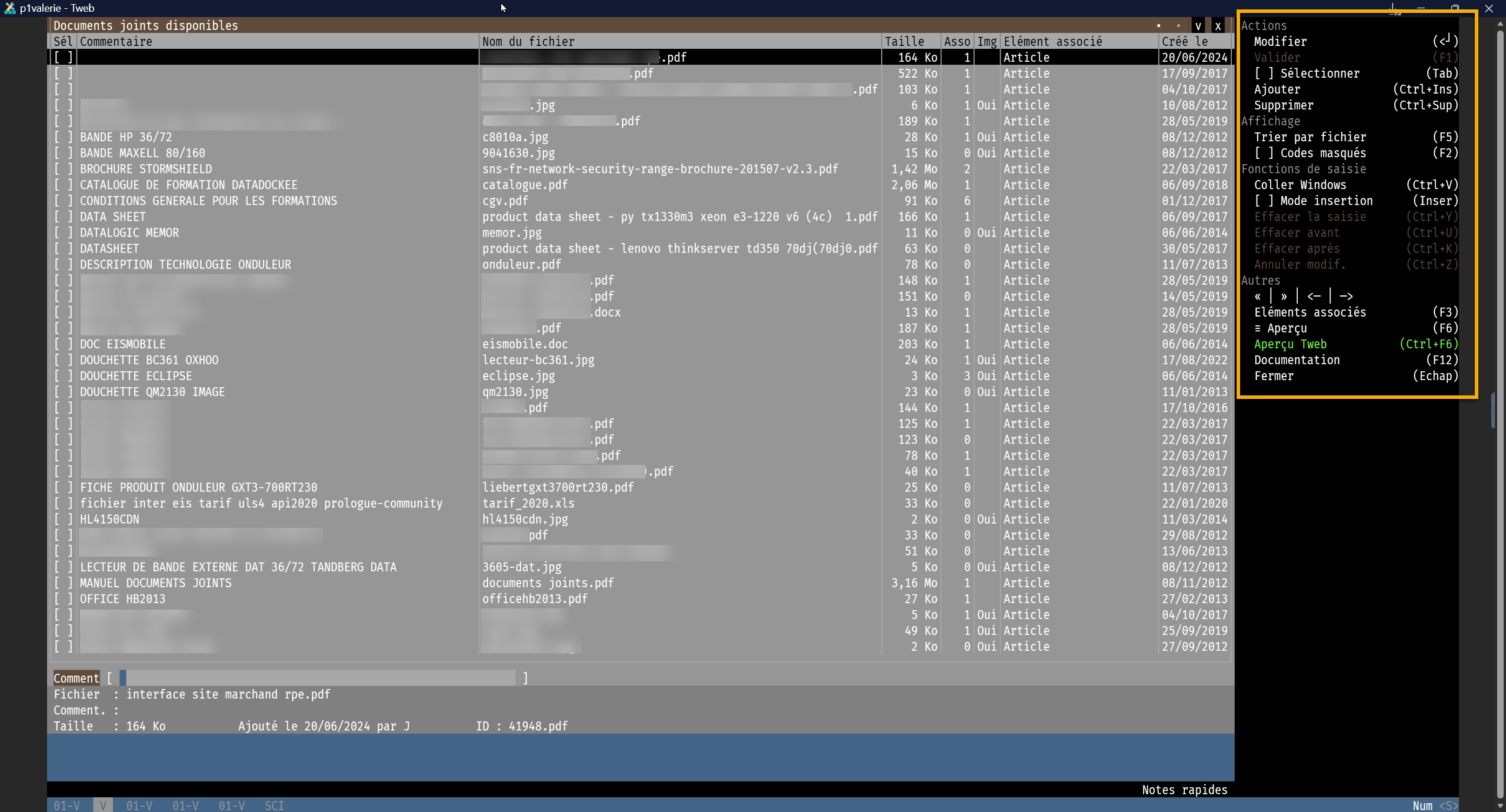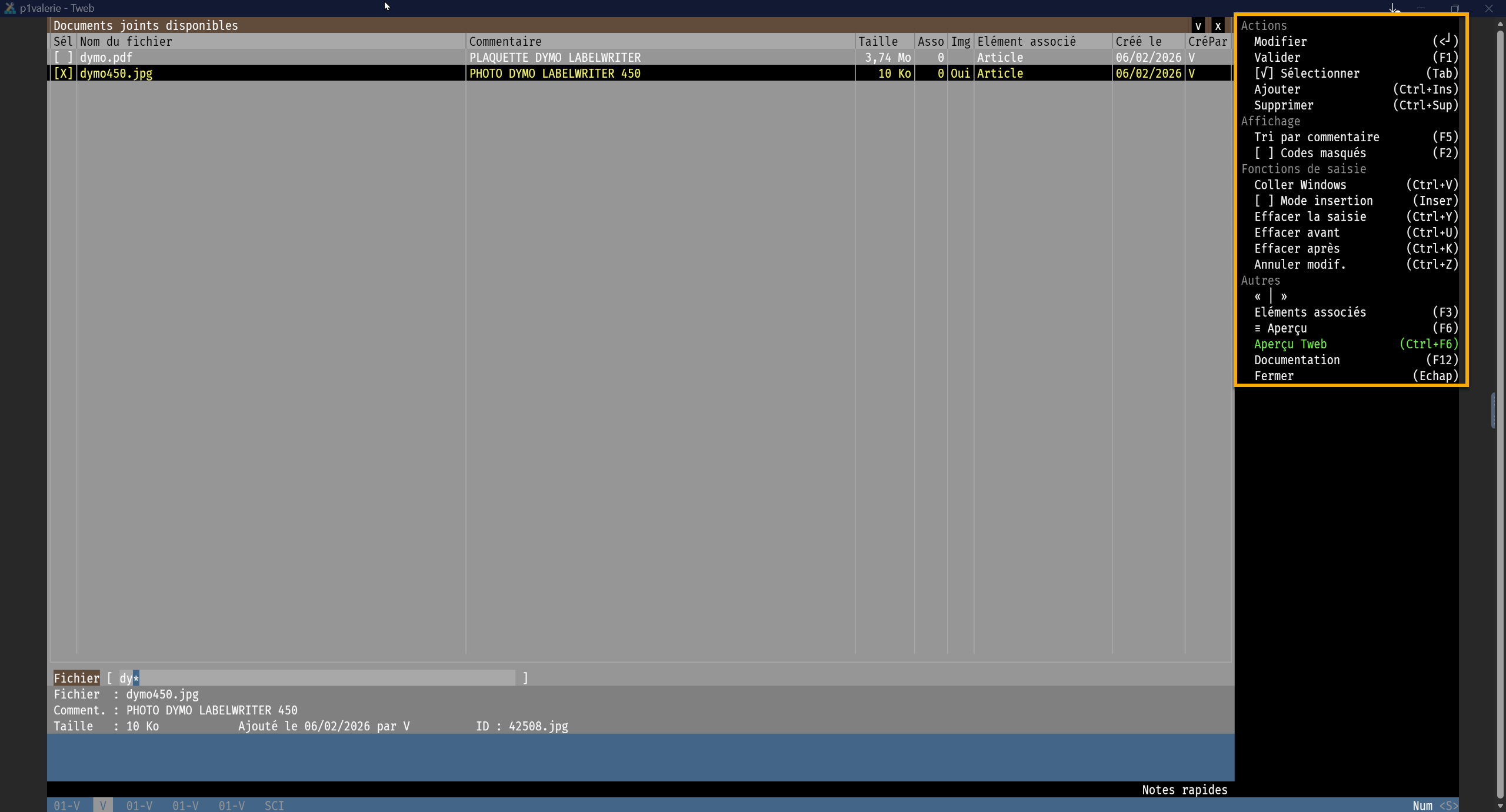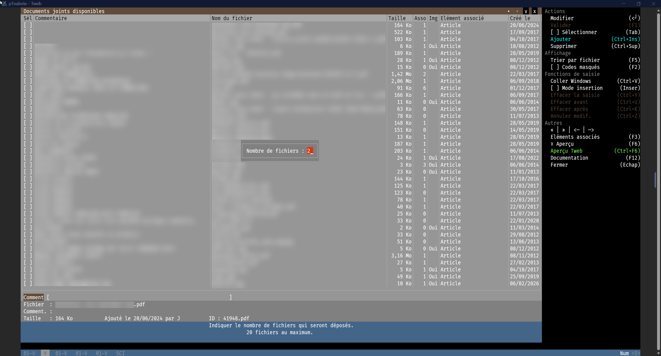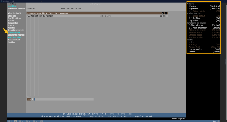 Les fonctionnalités cliquables se trouvent sur le volet de fonctions à droite de l'écran, il vous suffit de cliquer sur le lien correspondant ou d'utiliser les raccourcis clavier correspondant. Une première liste de documents disponibles à la sélection s'affiche : les documents déjà associés à l'article apparaissent dans une couleur différente.