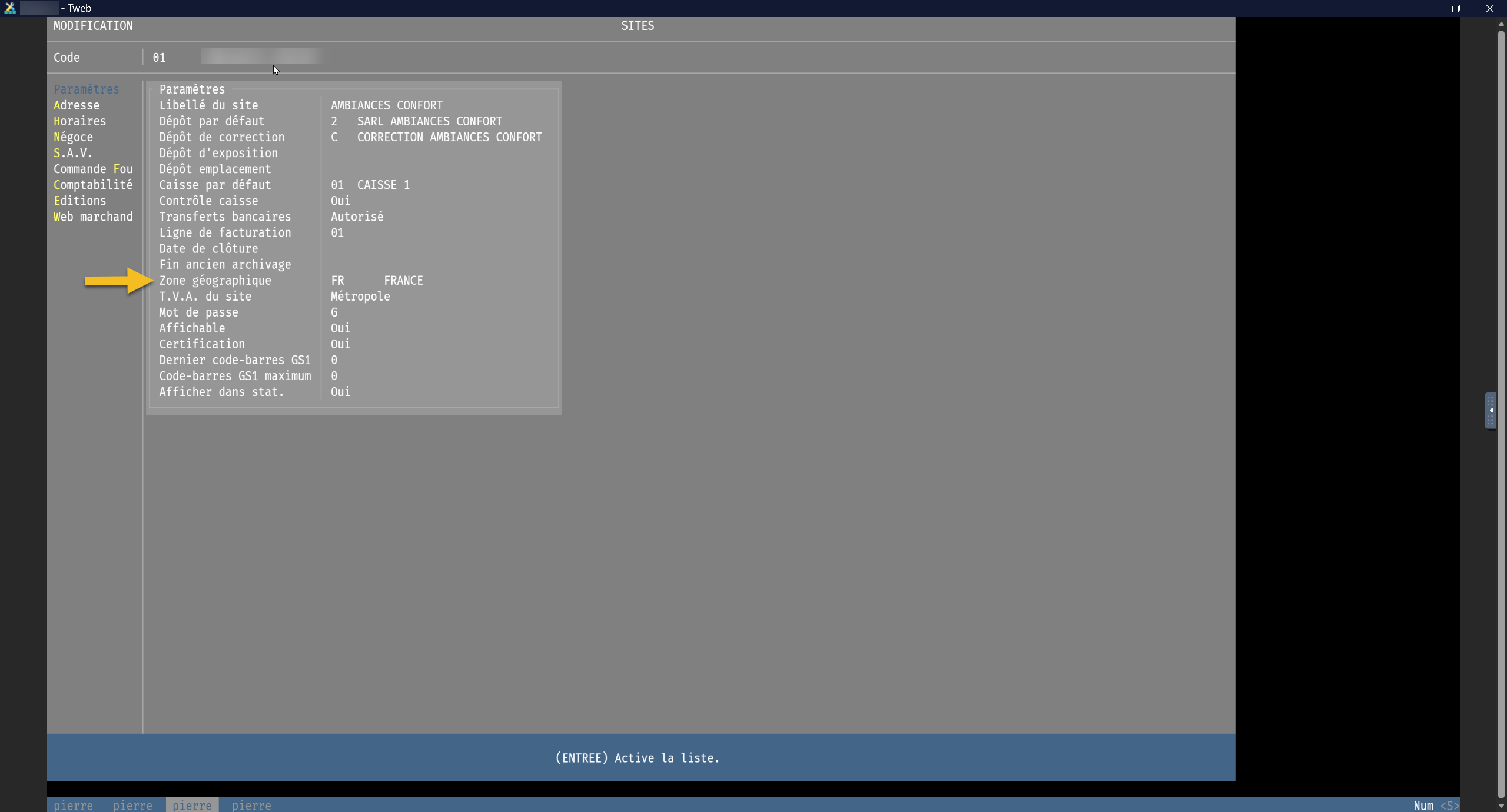 Dans chaque site, vous indiquerez sa zone géographique ; ainsi tous les sites associés à la même zone auront la même tarification de vente.