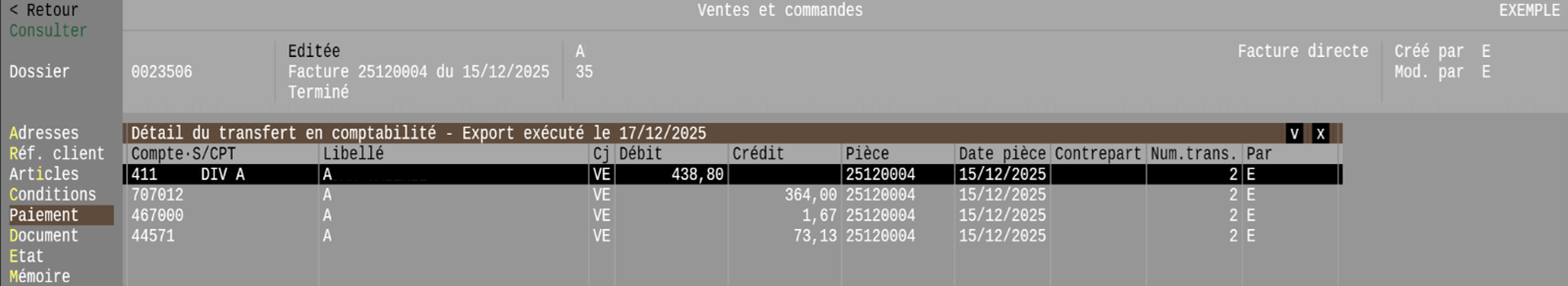 Depuis la fenêtre « Paiements », la touche de fonction (F11) « Visu. comptable » affichera le transfert en comptabilité qui a été mémorisé en base de données.