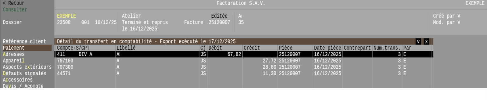 Exemple d'affichage du transfert en comptabilité S.A.V. mémorisé