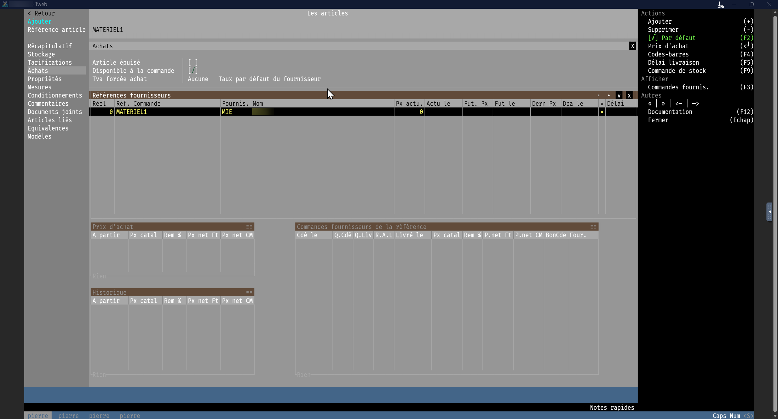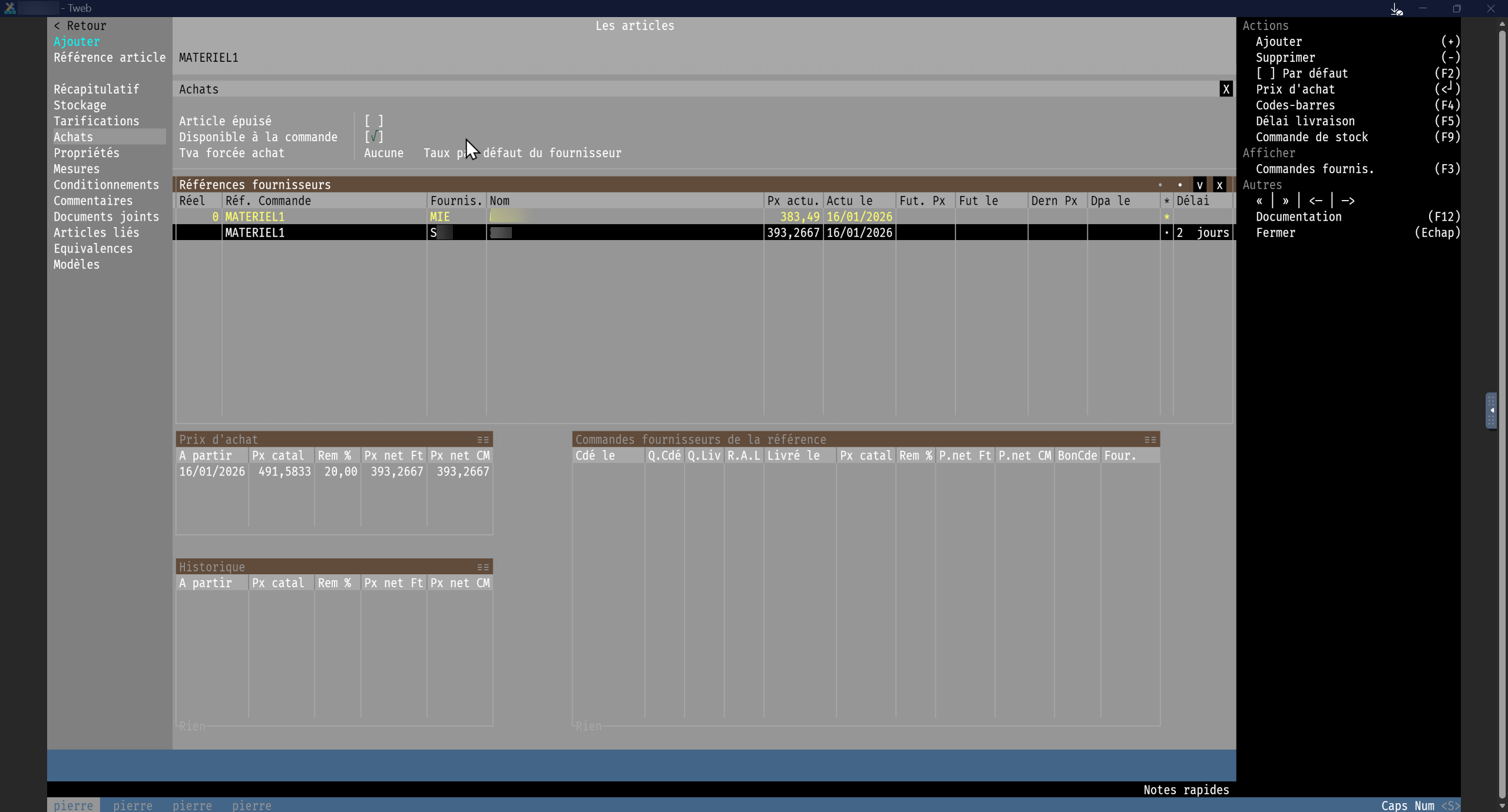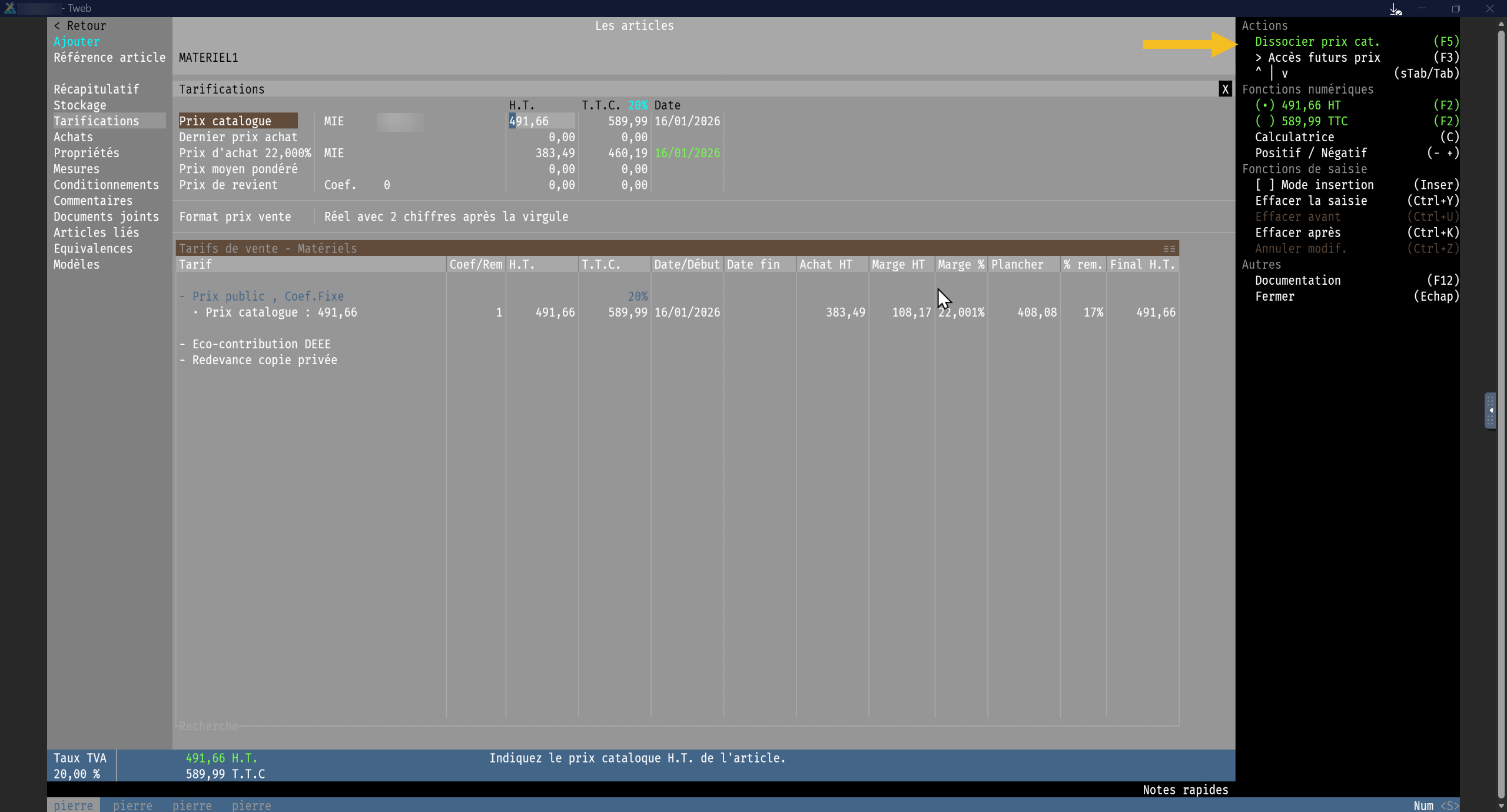 Fabricant / Grossiste « Tarif matériels » (Saisie obligatoire) |